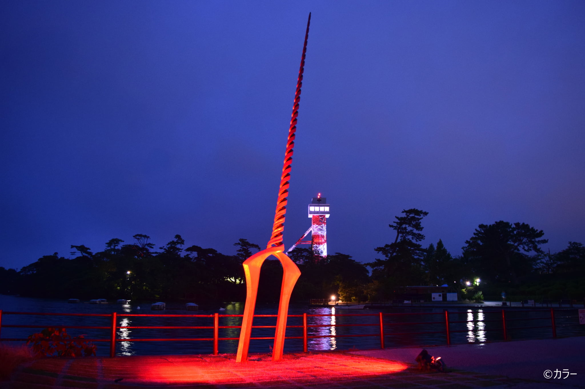 第3弾の企画で地元企業の技術を駆使して製造された全長7mを超える「ロンギヌスの槍」がときわ公園に刺さっています。日没後は赤くライトアップされた様子を楽しむことができます。
